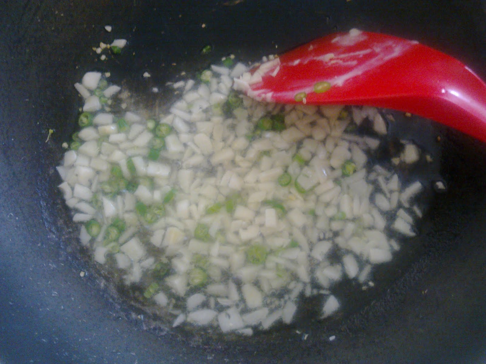 Bawang putih dicincang dan 4 biji cili padi.